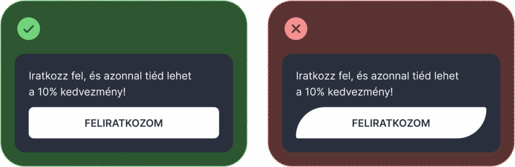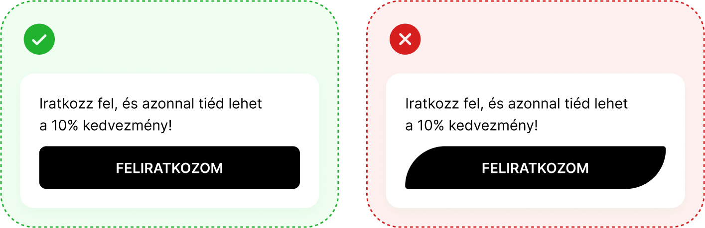 A gomb legyen mindig egyértelműen felismerhető funkcióként, ne pedig vizuális játék. Kerüld a túlformázást, különösen az olyan ötleteket, mint a csak két sarok lekerekítése vagy a levélszerű alakzatok, mert ezek könnyen összezavarják a felhasználót. Használj egyszerű, jól olvasható formát, kontrasztos színt, következetes stílust az egész oldalon, és hagyj elegendő térközt körülötte, hogy érvényesülni tudjon. A cél az, hogy a gomb gombnak nézzen ki – és ne kérdőjelezze meg senki, mire való.