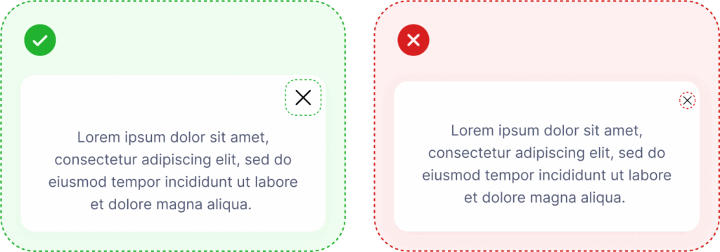 Egy hatékony popup mindig tiszteli a felhasználó döntési szabadságát. A bezáró gombnak jól láthatónak, könnyen elérhetőnek és azonnal használhatónak kell lennie – nem több másodperccel később, hanem rögtön, amikor a popup megjelenik. Az is nagyon fontos, hogy a tervezésnél figyelembe vegyük, hogy a bezárás ikonnál mekkora a kattintható rész. Hiszen például mobilról nagyon nehéz lekattintani egy pár pixeles ikont.